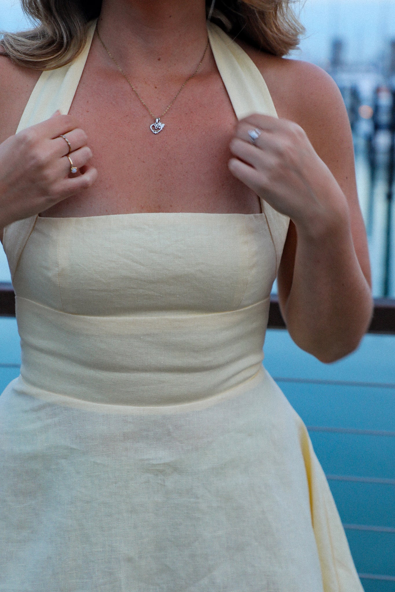Meet our new signature style: effortless elegance with a Mediterranean soul. Inspired by the golden allure of Palma evenings, this halter-top dress is where timeless chic meets refined design. A square neckline frames the décolletage, while shirring and top-stitched panels create subtle structure. The corset back ensures an adjustable, sculpted fit that moves with you.
