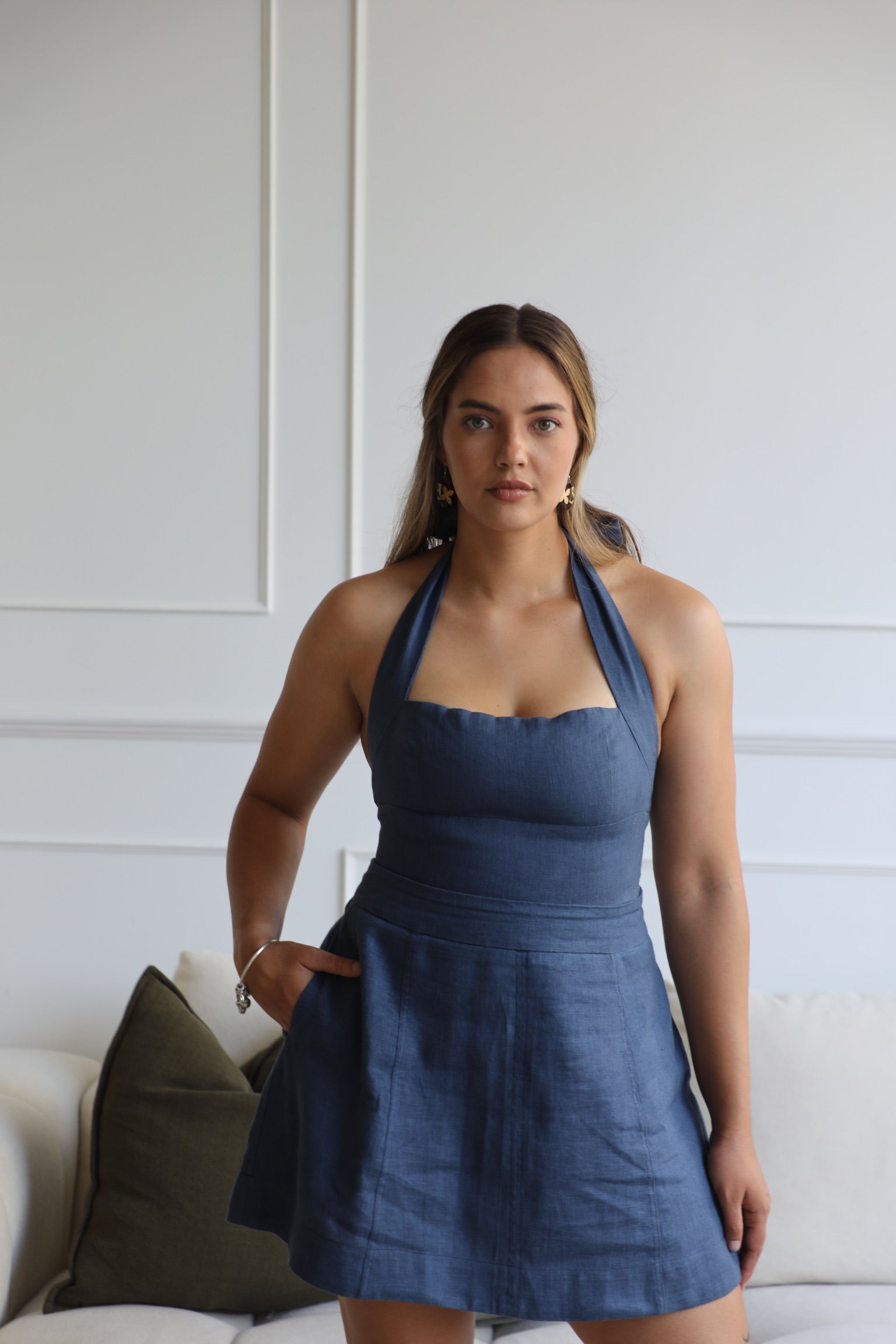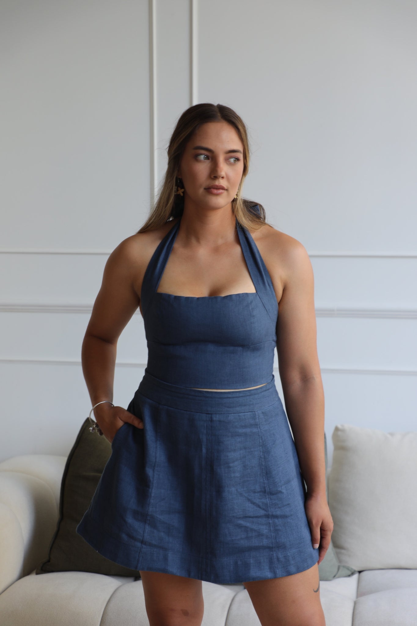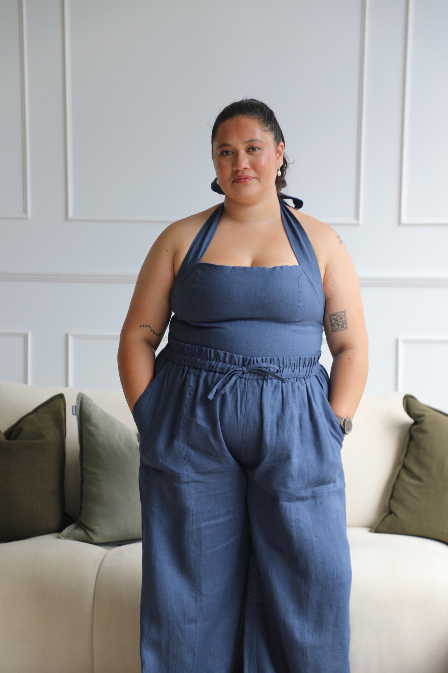 We use 100% pure linen — no blends, no shortcuts. Just breathable, natural fibre that gets softer with every wear. Our pieces are made in partnership with small-scale manufacturers who specialise in craftsmanship, not mass production. Every seam, stitch and shirred panel is done with intention — because details matter.